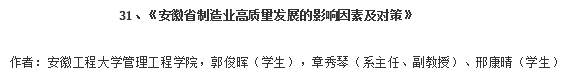 近日,2019年中国国际贸易学会举办的“中国外经贸发展与改革”征文获奖名单在中国国际贸易学会网站公示。经过初评、复评、终评和总评两个多月的四轮专家评选,最终从全国209篇稿件中共评选出一等奖、二等奖、三等奖、优秀奖论文56篇。由管理工程学院章秀琴副教授指导的题名分别为“一带一路沿线国家基础设施联通水平评价”(第一作者:国贸16邢康晴)、“安徽省制造业高质量发展的影响因素及对策”(第一作者:国贸17郭俊晖)的两篇论文均获得优秀奖。
