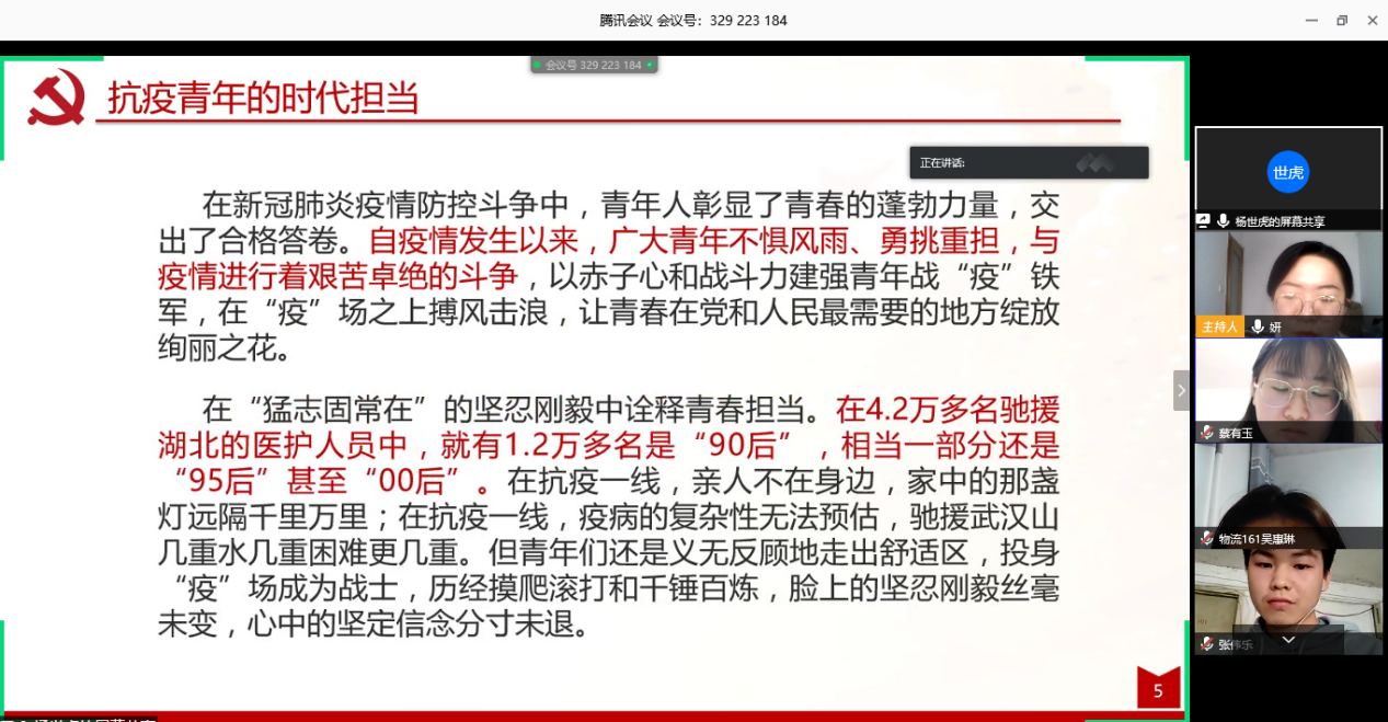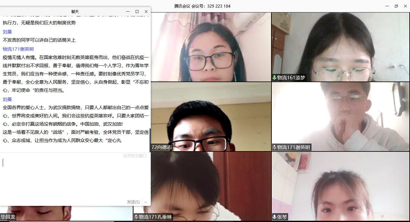 为增强学生党员使命意识,在疫情防控工作中提高思想认识,物流管理专业学生支部于325日开展线上主题党日活动,以“牢记党员使命,争当防疫先锋”为主题进行线上发言讨论,交流学习心得。